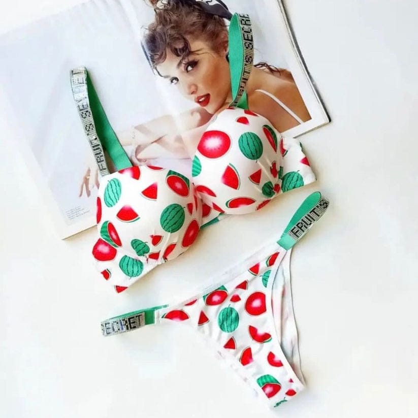 Elevate your intimate wardrobe with our Fruit-Print Glamour Set, a playful yet luxurious ensemble that blends high-fashion branding with vibrant, seasonal aesthetics. This coordinated set is designed for the individual who seeks a bold, "statement-piece" look without sacrificing the premium quality associated with world-class designer labels.